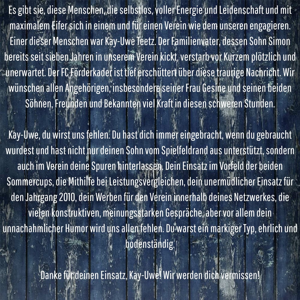 Es gibt sie, diese Menschen, die selbstlos, voller Energie und Leidenschaft und mit maximalem Eifer sich in einem und für einen Verein wie dem unseren engagieren. Einer dieser Menschen war Kay-Uwe Teetz. Der Familienvater, dessen Sohn Simon bereits seit sieben Jahren in unserem Verein kickt, verstarb vor Kurzem plötzlich und unerwartet. Der FC Förderkader ist tief erschüttert über diese traurige Nachricht. Wir wünschen allen Angehörigen, insbesondere seiner Frau Gesine und seinen beiden Söhnen, Freunden und Bekannten viel Kraft in diesen schweren Stunden.