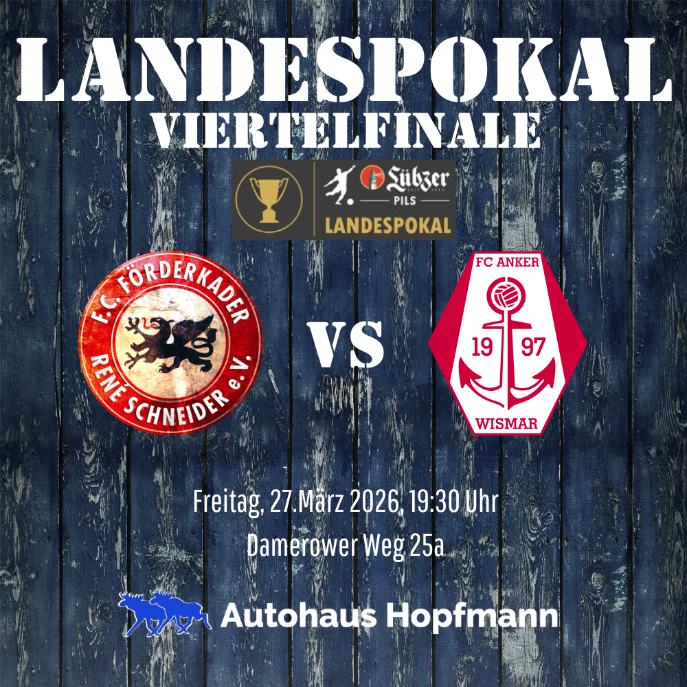 Morgen um 19:30 Uhr ist es endlich soweit. Das Spiel, auf das alle sehnsüchtig gewartet haben. Im Viertelfinale des Lübzer Pils Landespokals MV trifft der FC Förderkader René Schneider auf den Oberligisten FC Anker Wismar.