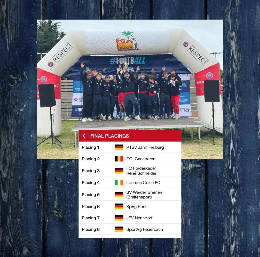 Mit vollem Fokus visiert Torhüter Oskar Wittfoth seinen irischen Gegner von Lourdes Celtic FC an. Lange bleibt der 13-Jährige auf der Linie. Der Schütze läuft an, Oskar ahnt die Ecke und pariert! Die Entscheidung! Seine Teamkollegen sprinten zum Hexer, der im gesamten Turnier sechs (!) Elfmeter entschärfte und bejubeln einen tröstenden und völlig verdienten dritten Platz. Im vorherigen Halbfinale gegen den PTSV Jahn Freiburg unterlag man noch in der Elfer-Lotterie – auch, weil ein korrekter Treffer von Kapitän Noah Aßmus nicht gegeben wurde.